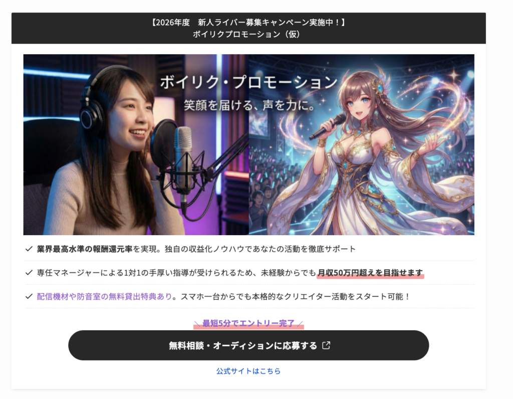 ※イメージ内の「ボイリク・プロモーション」および「VOI-LIVE」は、本資料のために用意した架空のサービス名称です。