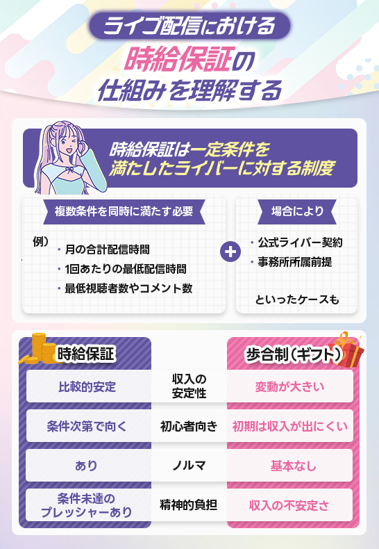 時給保証は「条件を満たした配信活動への報酬」であり、雇用の給料とは性質が異なる点も踏まえて検討するとよいでしょう。